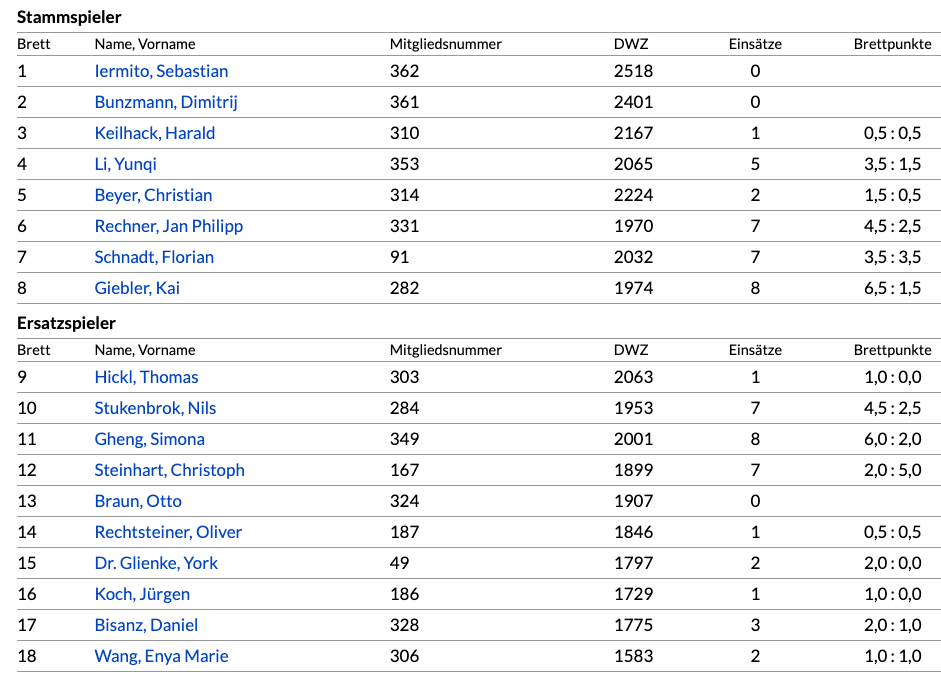Doch von diesem Ausrutscher abgesehen machte es die Erste sehr gut und erspielte sich am Ende nicht nur Platz 2, sondern sammelte mit 63,5 von 80 möglichen Brettpunkten fast 80% und damit sogar die meisten im gesamten Turnier. Wenig überraschend war da auch ein Brettsieg dabei, Kai Giebler holte an Brett 4 18/20 und war damit auch gleichzeitig der erfolgreichste Punktesammler im gesamten Turnier. Auch Simona Gheng konnte mit 17/20 an Brett 3 ein tolles Ergebnis erzielen, Thomas Hickl erreichte 14,5/20 und Nils schlug sich in der ausgeglichen besetzten Mannschaft am Spitzenbrett sehr wacker mit 14/20.