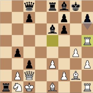 Hier und im weiteren Verlauf nochmal hätte Bryan gegen Bad Mergentheim mit h6 alle gegnerischen Drohungen eliminieren können, sein Angriff am Damenflügel ist dagegen für weiß nicht mehr aufzuhalten. Stattdessen fiel einige Züge später der f6 mit undeckbaren Mattmotiven, da h6 jetzt einfach rausgenommen wird.