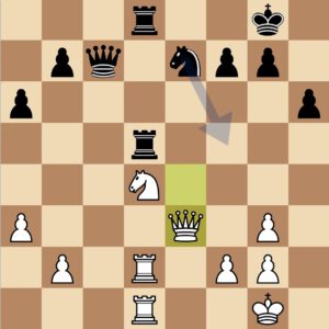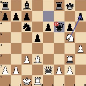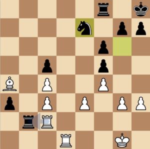 Hier hätte Moritz z.B. mit b4 in ein vorteilhaftes Endspiel überleiten können. Die forcierte Zugfolge wäre Sa4 Sxf3; Dxf3 d5; Lxd5 Lxd5; Dxd5 Dxc2 und weiß kann die Stellung kaum noch gewinnen. Auch Ta7 war eine gute Möglichkeit. Sxf3 war dagegen nicht ideal und auf Dxf3 Ta7 nahm der Gegner den d6 dann doch noch und das sofortige zurückholen des Bauern durch Lxc3 leitete dann endgültig die Niederlage des Teams gegen Bad Mergentheim ein.